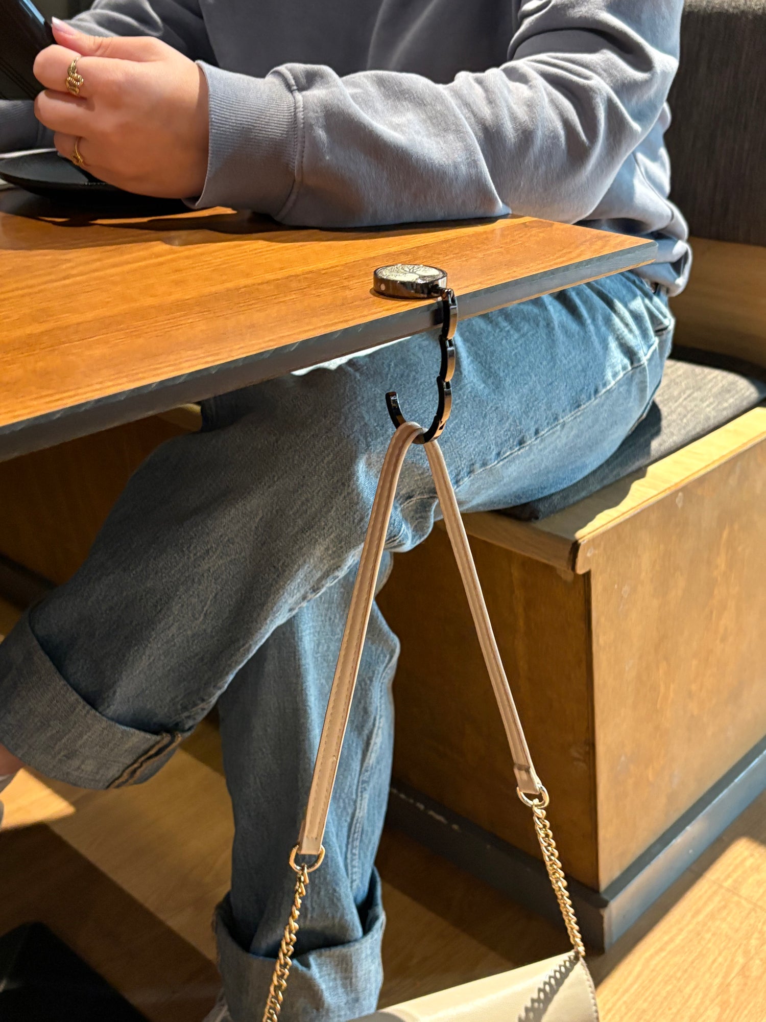 Hæng den på bordkanten – krogen folder automatisk ud. Klar til at holde din taske, uden den rører gulvet